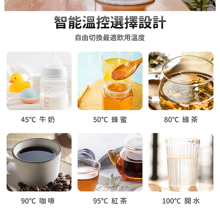 .六段智慧溫度設定(40/50/80/90/95/100℃),精準控制奶粉、花茶、咖啡、烏龍茶所需溫度