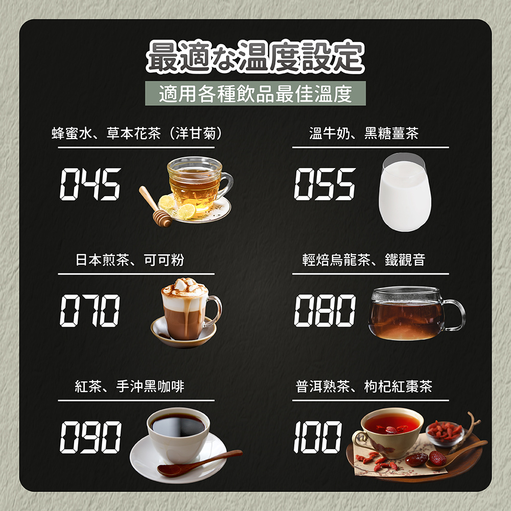 .6段精準調溫 (45/55/70/80/90/100℃),從沖奶、泡茶到手沖咖啡,都能找到專屬溫度