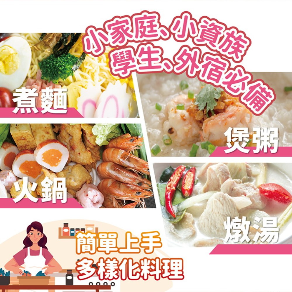 .火鍋、麫食、湯品、煲粥….等多樣烹調方式,一鍋搞定。